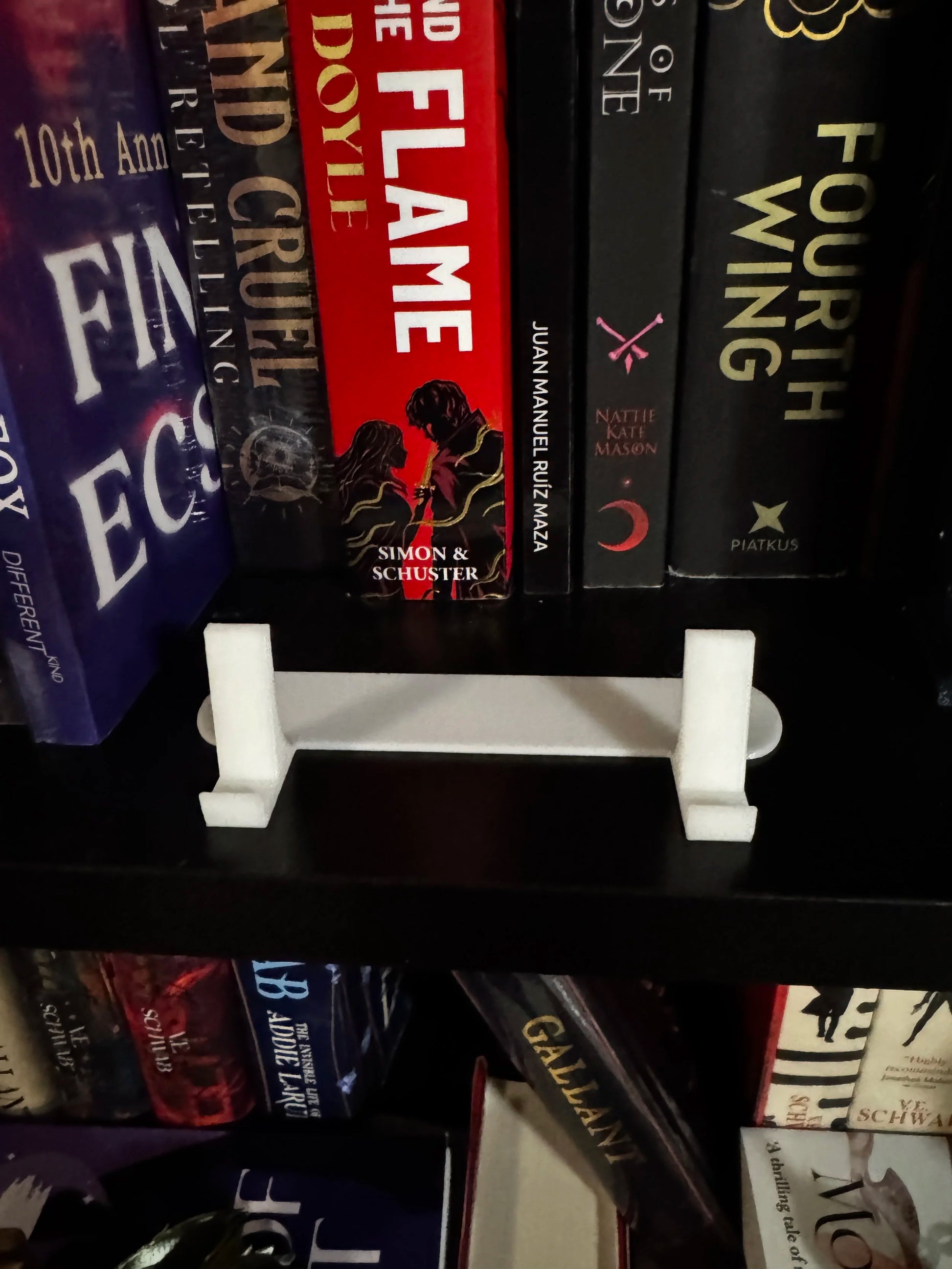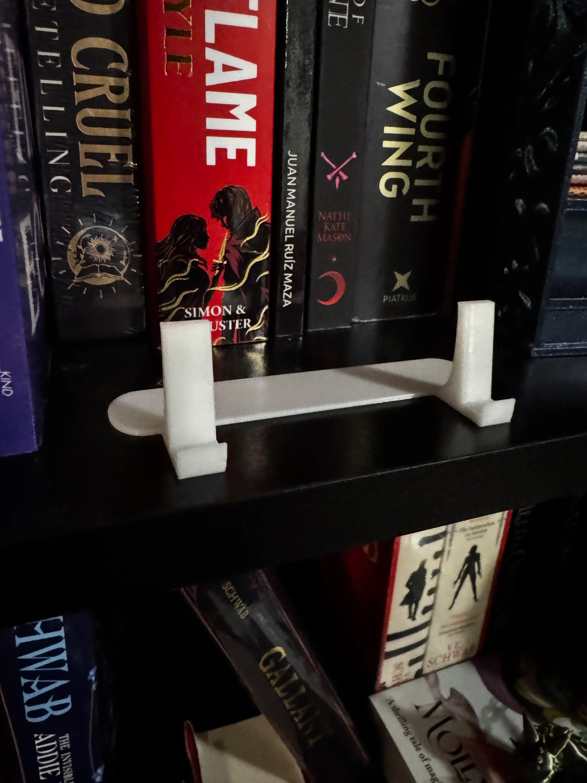 The stand features a flat surface on the back so you can slide it under your books for those of you lacking in shelf space. The stand will hold items that are approximately 4mm thick and about 6-7cm tall.
