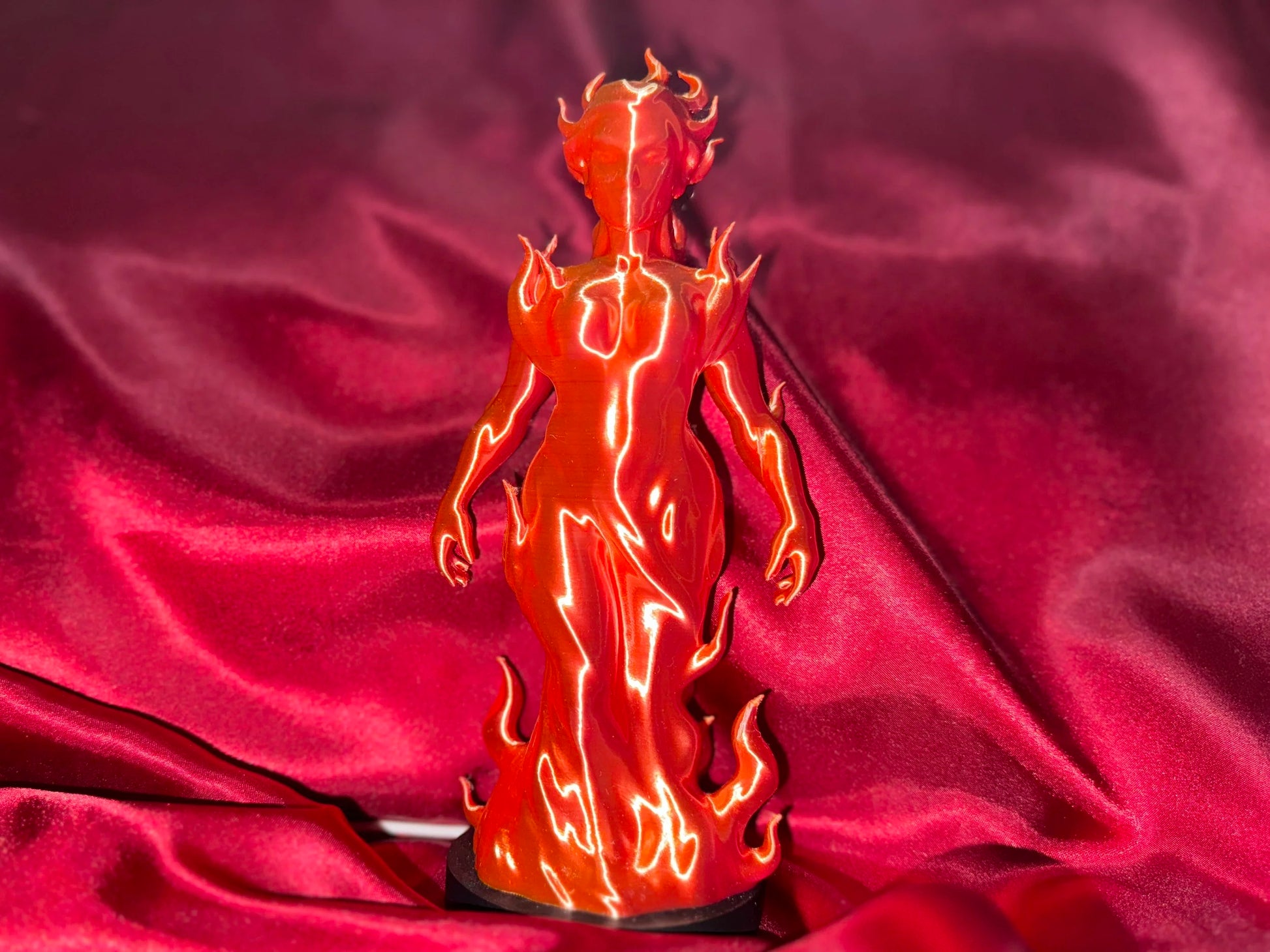 Dual silk PLA material that will either be red gold, or orange depending on the angle the light hits her